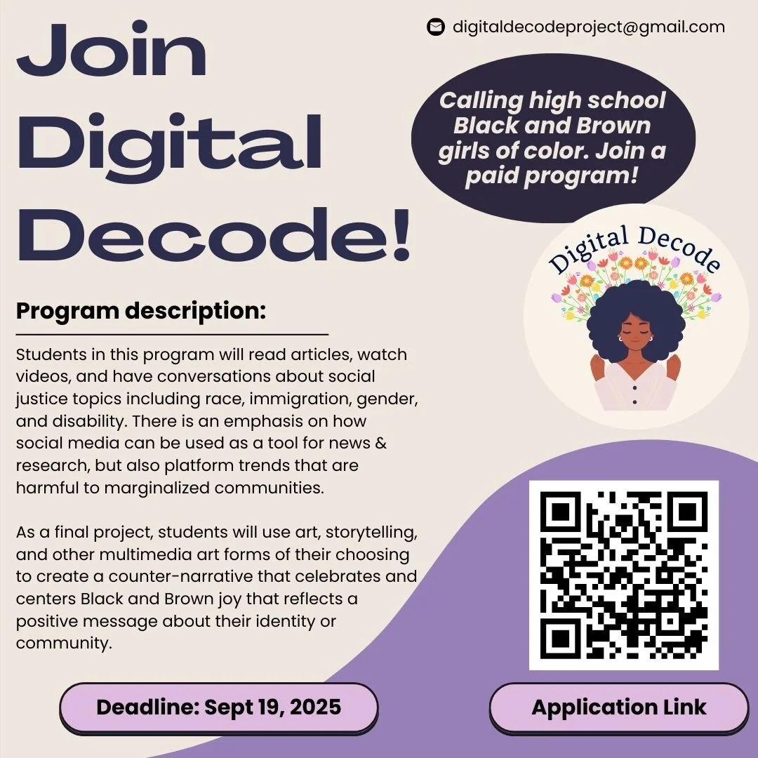Digital Decode is accepting applications for our second cohort! This is a paid opportunity for Black and Brown girls in high school to learn about multiple social justice topics and create their own digital media projects.